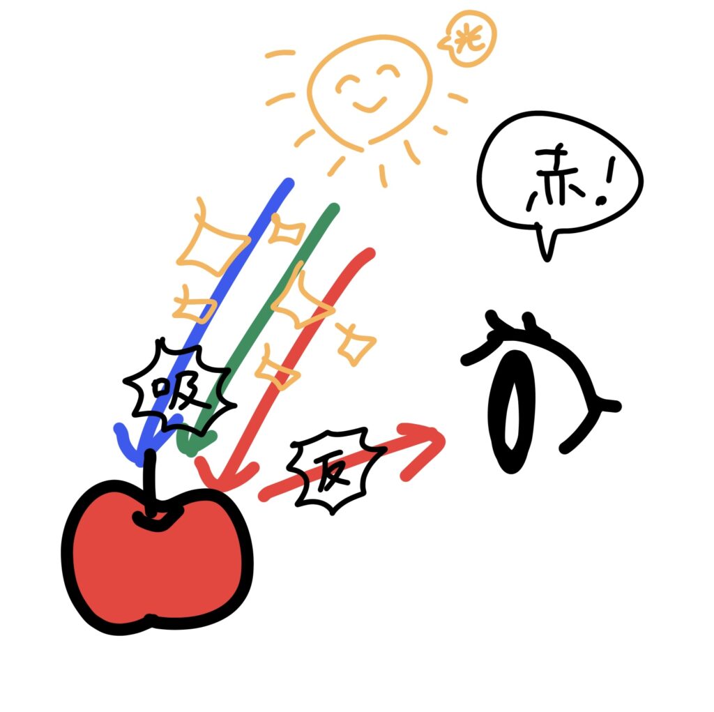 りんごに当たった光は、赤い波長を跳ね返してくるから赤く見える。